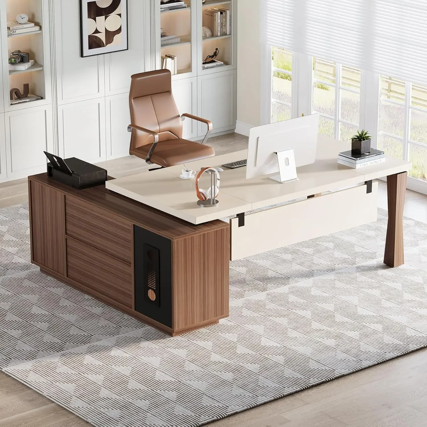 - EXQUISITE DESIGN: With its combination of cream white and walnut veneer, this L-shaped executive desk adds a touch of timeless elegance to any room.Its corner has a chic and stylish design that makes it the good office desk, ensuring your workdays are wonderfully enjoyable.