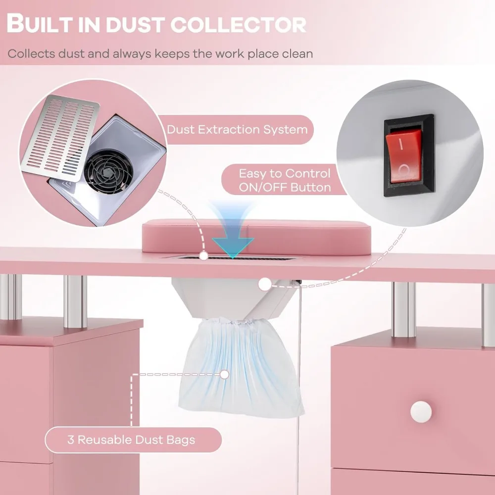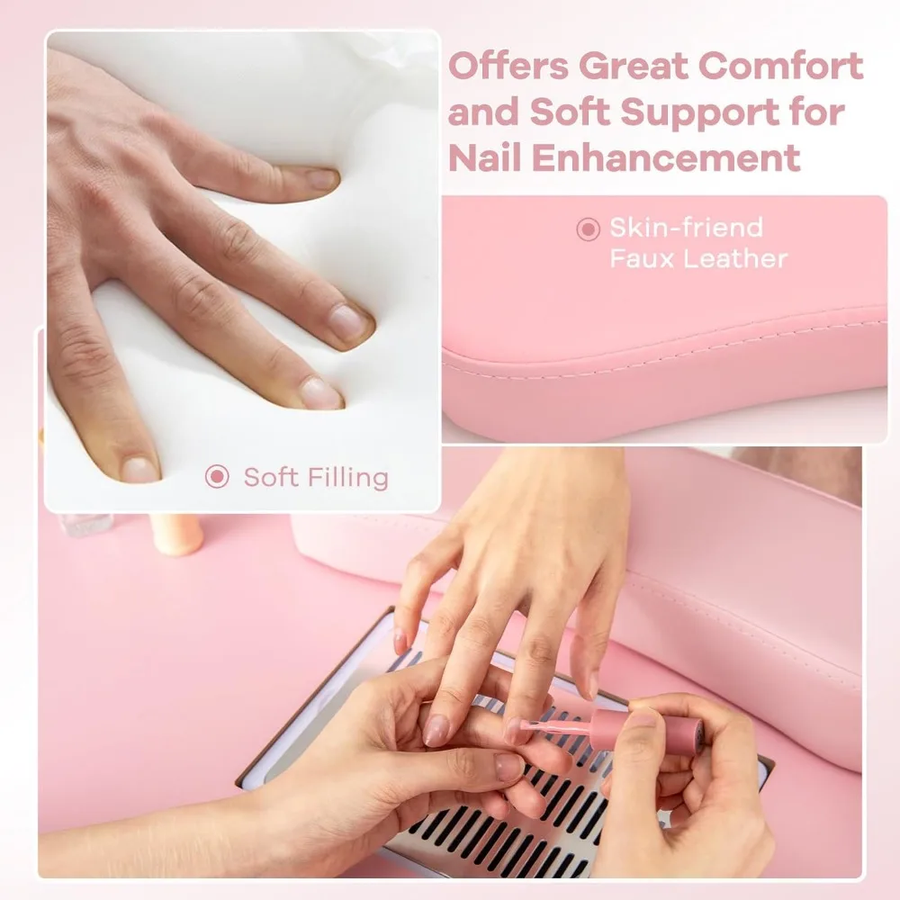 - ALL-IN-ONE NAIL TABLE-This manicure table includes a dust extraction system with 3 extra dust bags, a padded nail tech arm rest, made of high density sponge and waterproof, oil-resistant faux leather that provides great comfort and soft support for nail enhancement.
