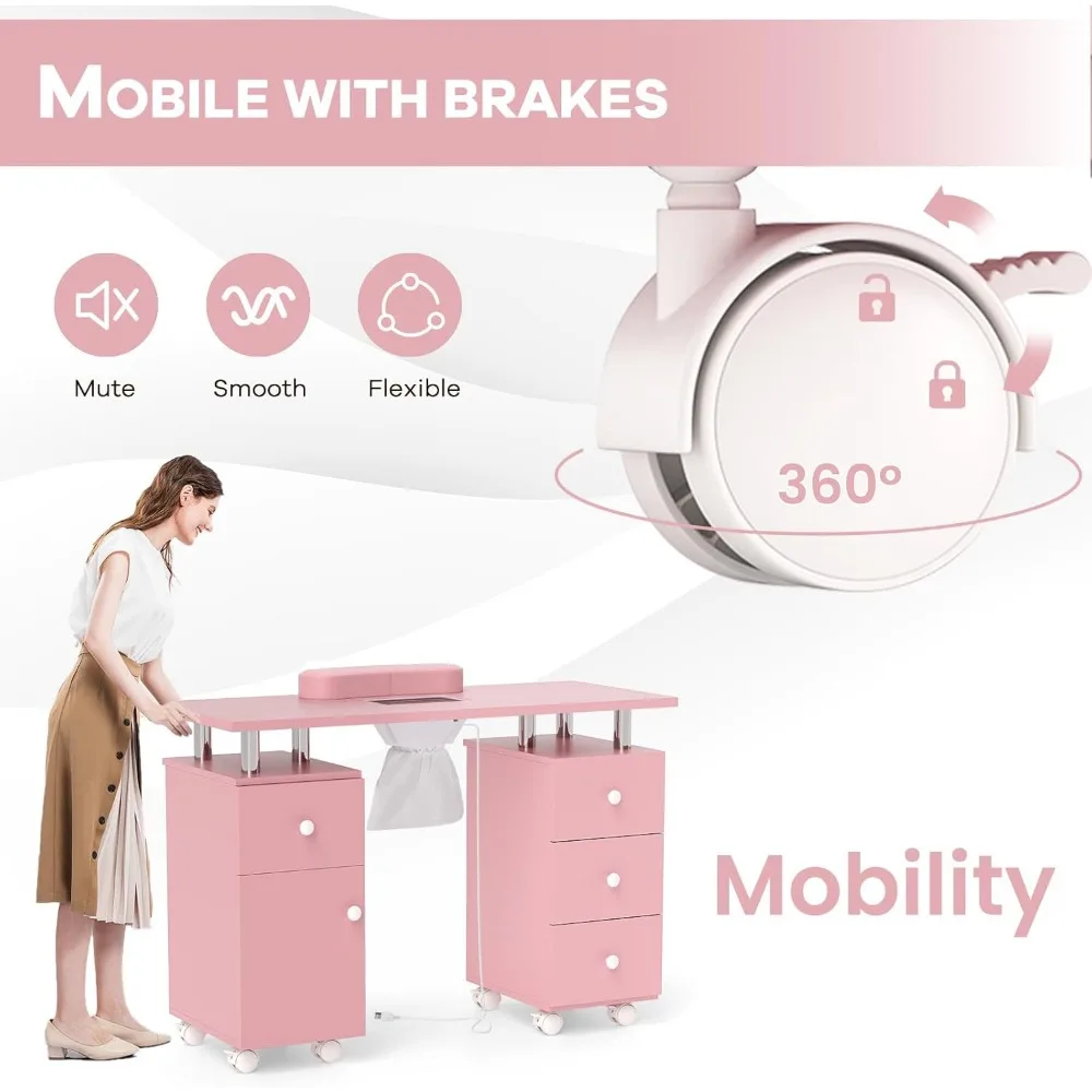 - MOBILE MANICURE DESK- Equipped with lockable wheels, WELLHUT nail tech desk can be moved and locked into place, a good way to create extra space for high demands. With mute universal wheels our portable nail table keeps your work environment quiet while moving.